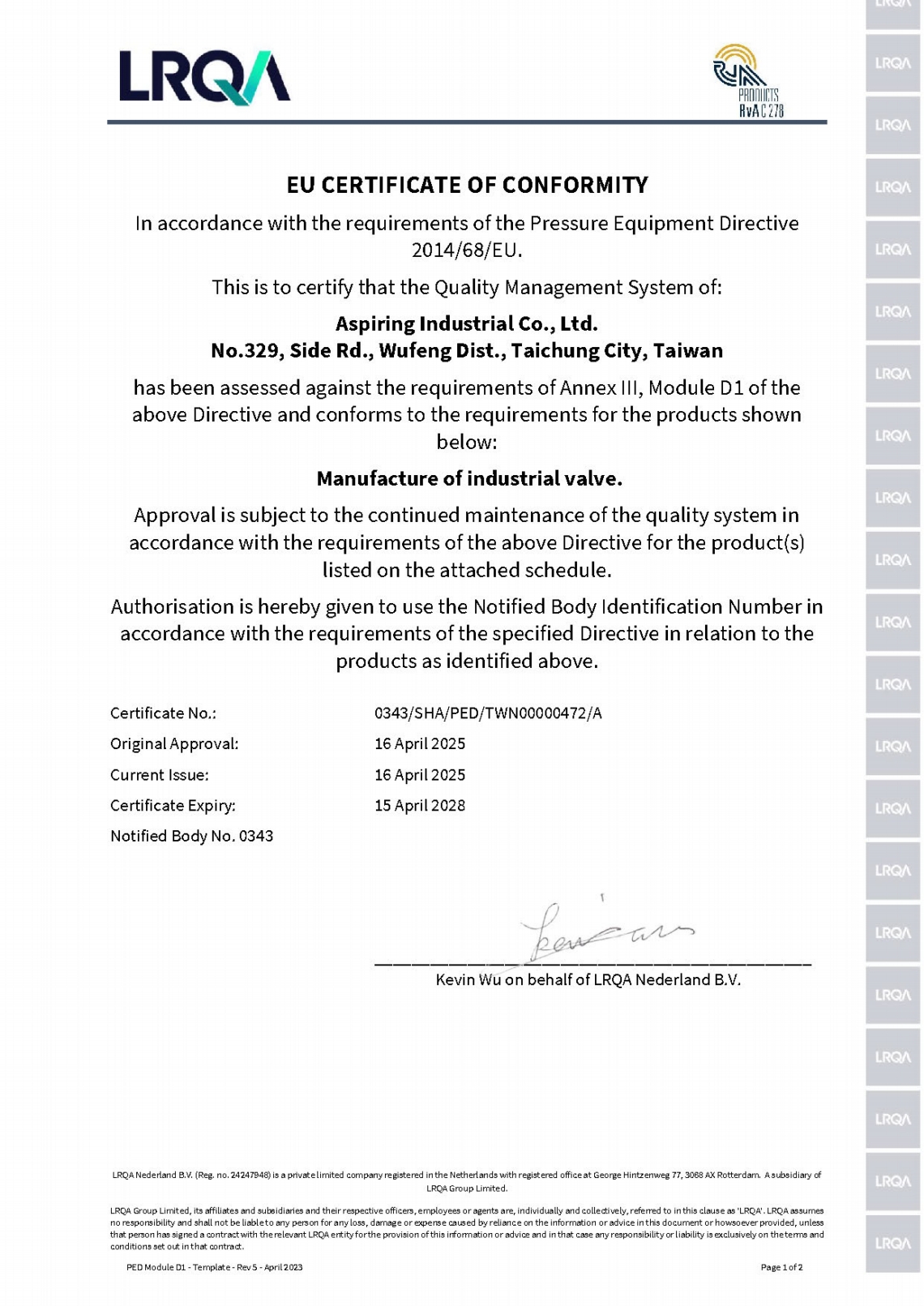PED 2014/68/EU 通過日期:2025年 4月 16日 證書編號:0343/SHA/PED/TWN00000472/A