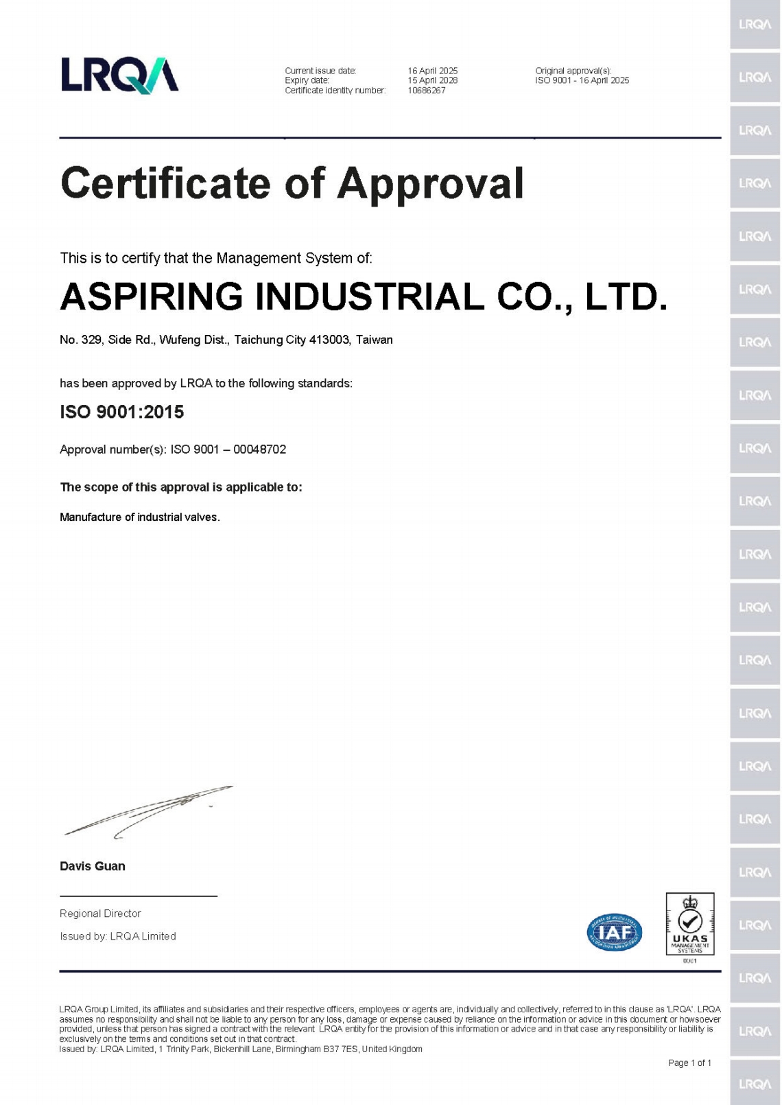 ISO 9001:2015 通過日期:2025年 4月 16日 證書編號:ISO 9001 / 00048702
